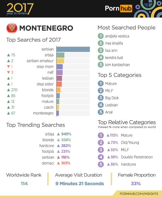 Montenegro’s number one search in 2017 was “serbian” followed by “srbija”, which increased by 949% in popularity over the last year. Serbian porn actress Anđela Mitkovski is the most searched person in Montenegro. Visitors are 113% more likely to view the Mature category compared to the rest of the world, and 73% more into Old/Young videos.