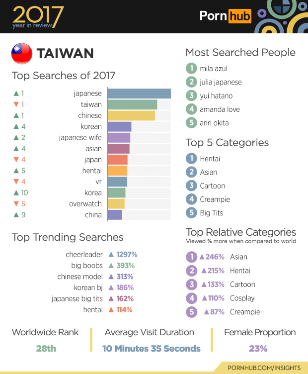 In 2017 searches for “japanese” overtook “taiwan” to become the number one Taiwanese search. The popularity of both “chinese” and “korean” searches also moved up the ranks into positions 3 and 4 of the most searched terms. Following the worldwide trend, searches for “cheerleader” grew by a massive 1297% in 2017. Visitors from Taiwan are 246% more likely to view the Asian category, and 215% more into Hentai than people in other parts of the world.