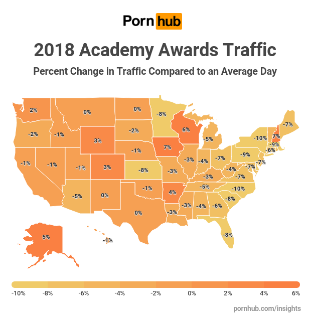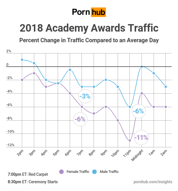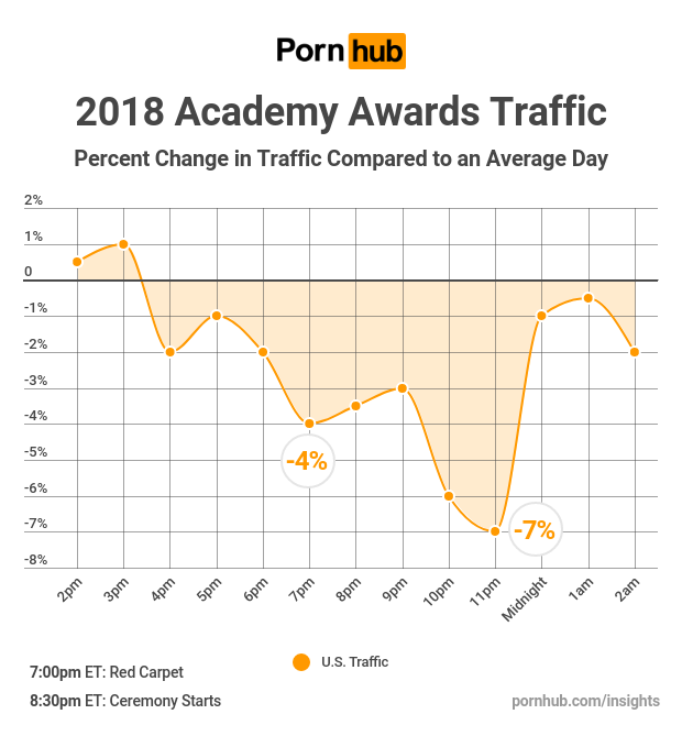 The 90th Annual Academy Awards took place on Sunday March 4th, so our friends at Cinema Blend checked in to see if Pornhub fans were willing to put their pornstar love on hold to watch their favorite Hollywood stars. The live coverage began at around 7pm Eastern Time, as celebrities strolled the red carpet, and Pornhub traffic across the United States dipped by as much as 4% compared to 7pm on a typical Sunday. The award show ceremony began at 8:30pm at which time traffic was only -3% below average.