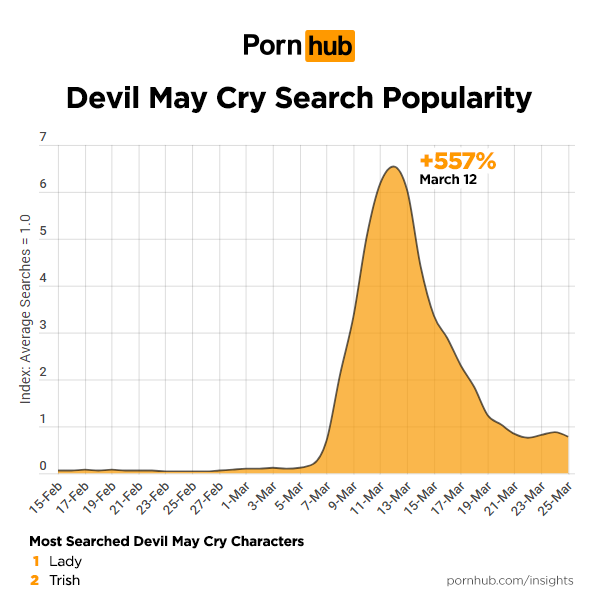 Devil May Cry 5 was released on March 8th and saw a peak of 557% above average on March 12th, while clocking in over 600,000 searches in just a few weeks.