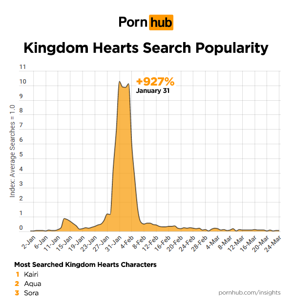 Kingdom Hearts was released on January 29th, and saw a peak searches 927% above average on January 31. Searches have since trailed off, but more than 1 million searches mean it’s made a noticeable impact on fans.