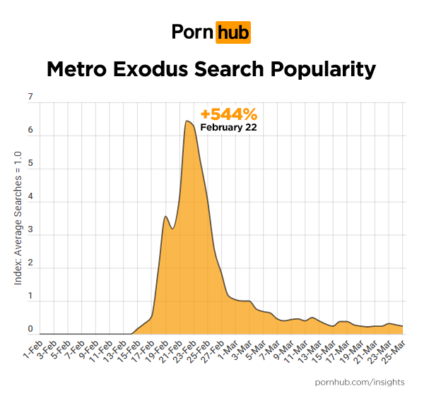 Next up is Metro Exodus, with searches 544% above average on it’s release date of February 22nd. Metro Exodus has since been searched over 240,000 times.
