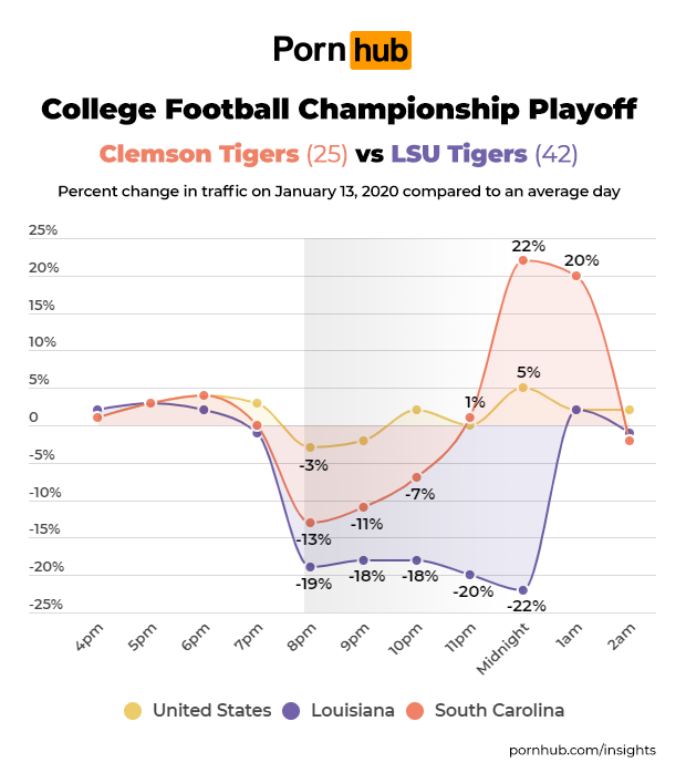 The game began at 8pm Eastern Time, at which point Pornhub’s traffic from Louisiana was down -19% below average, while South Carolina’s was down by -13%.