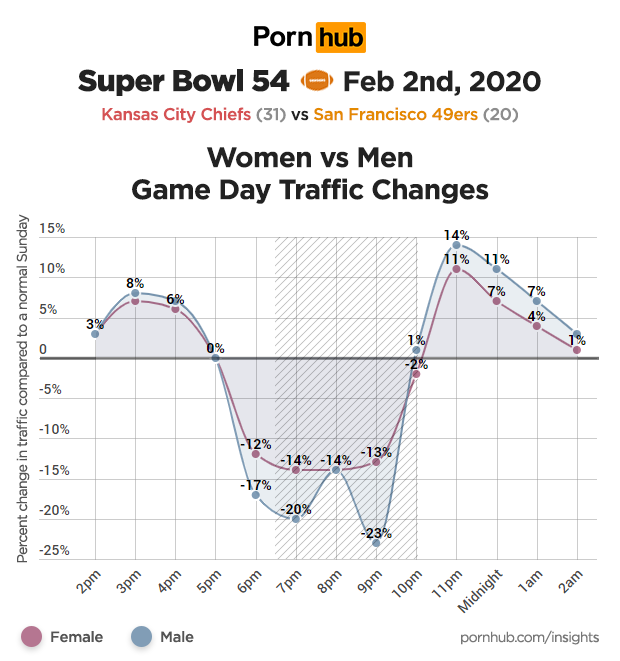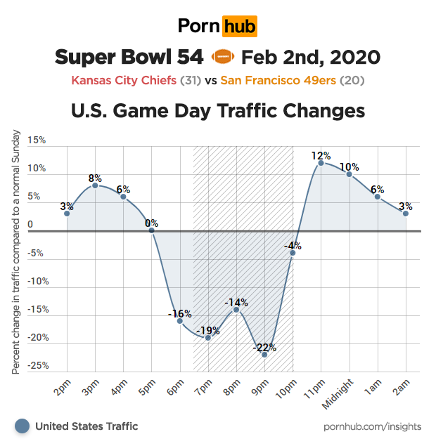 Shortly after the game ended, U.S. traffic to Pornhub surged +12% higher than normal, representing a massive increase when you consider that 11pm is Pornhub’s peak traffic time in the United States.