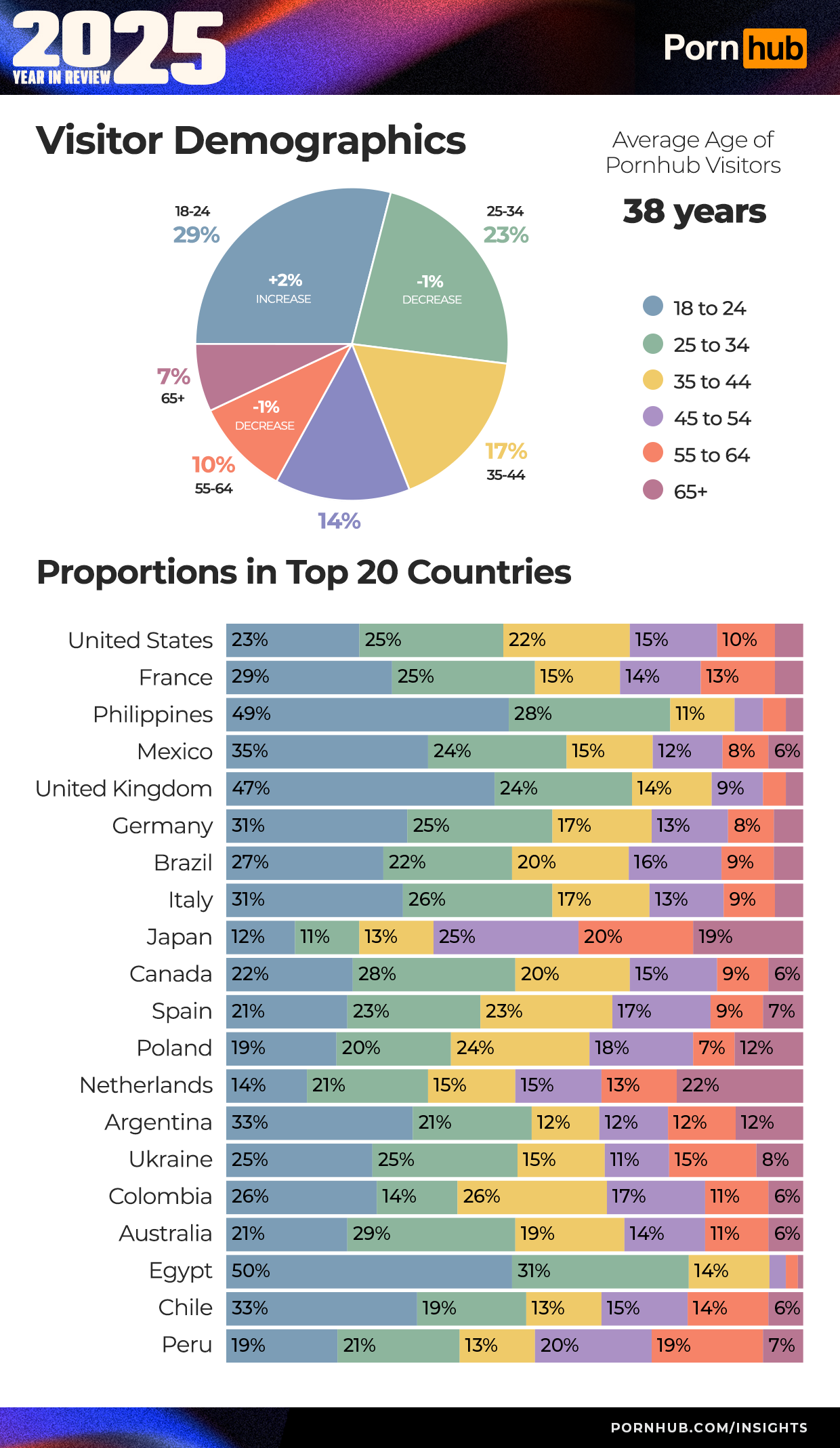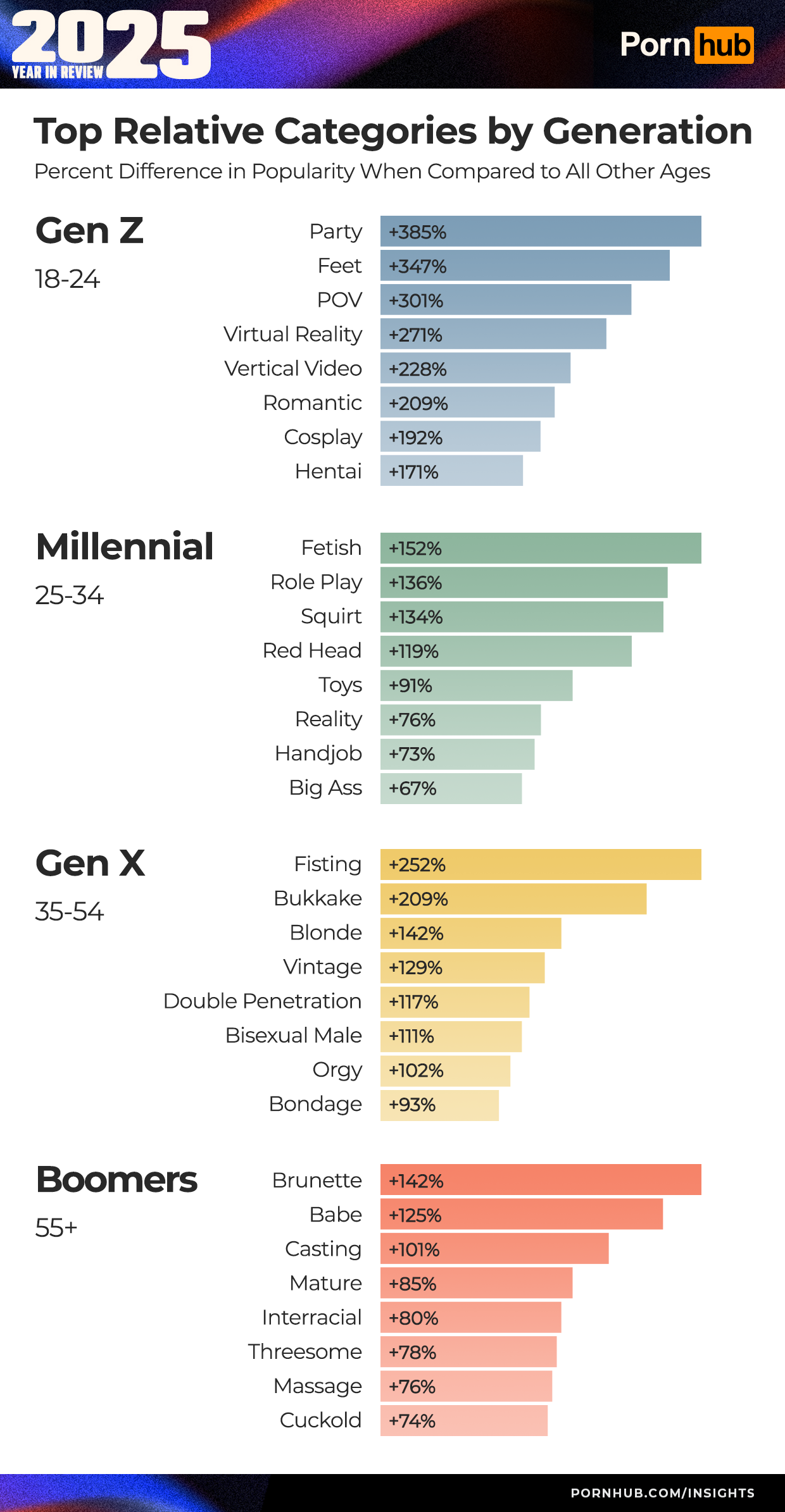 Explore our graphs and detailed summaries to discover how the world’s porn viewing habits unfolded in 2025. Whether you browse from start to finish or jump between the sections linked below, you’ll uncover how the gender gap influences interests, which states and countries have distinct preferences, the destinations that came to Pornhub most, the video game characters sparking new fantasies, and plenty of other surprises!