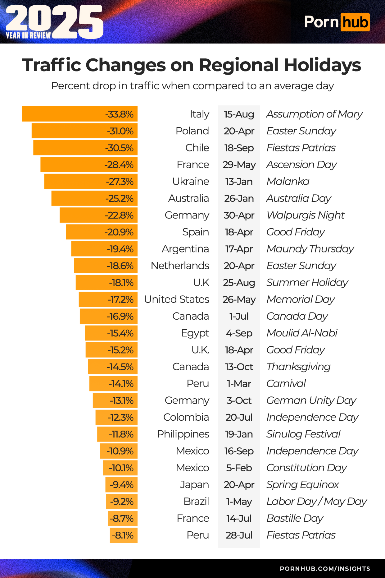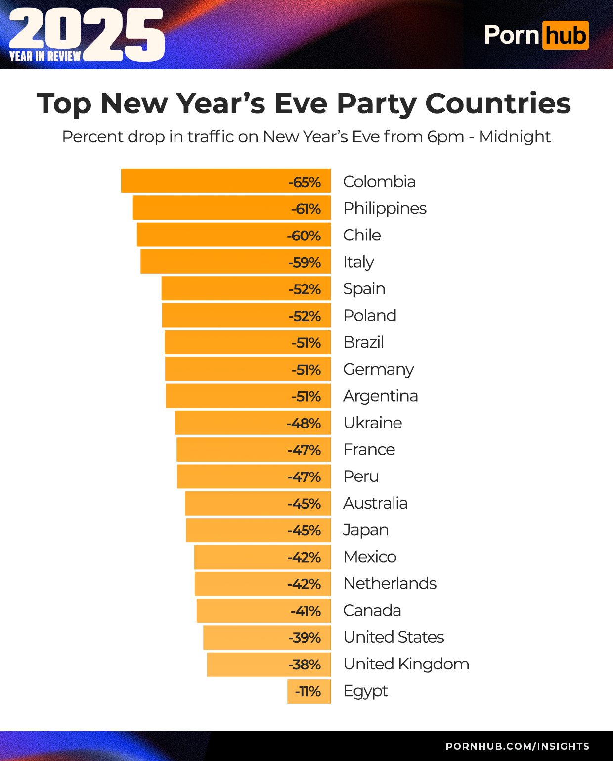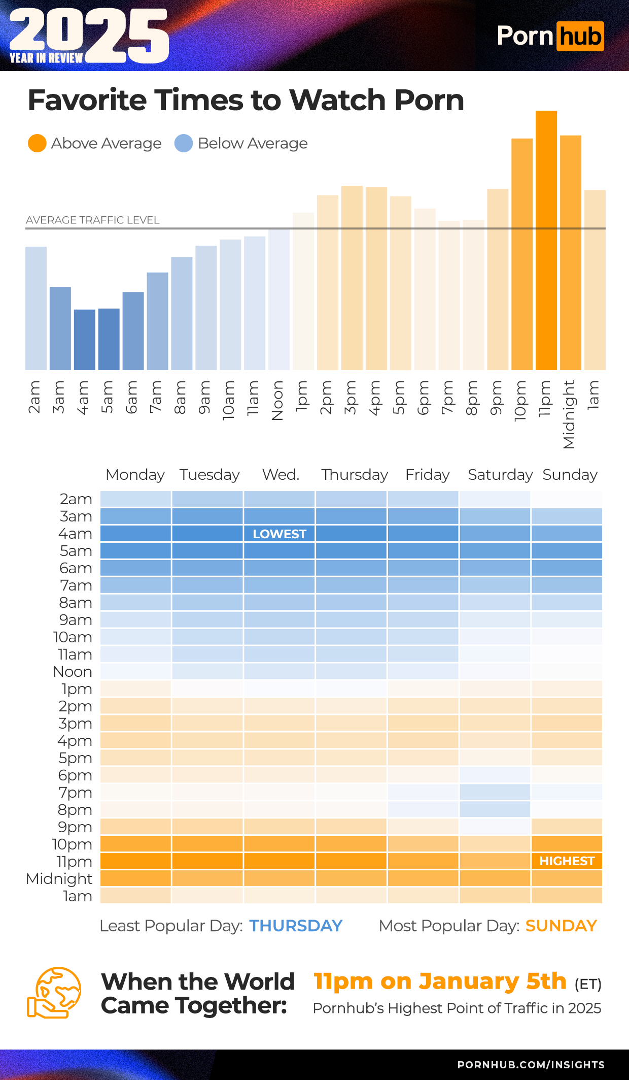 Finally, Pornhub’s highest point of traffic in 2025 was January 5, at 11pm, when the world came together. Why? We asked. There were several factors that could contribute to the high traffic. 1) The Golden Globes ended at 11pm that night. 2) The Lions vs Vikings football game ended at 11pm that night. And 3) There was a big winter storm across much of the United States, which meant more people were at home, indoors. Together, it created the perfect conditions for high traffic to people’s favorite site to end the night.