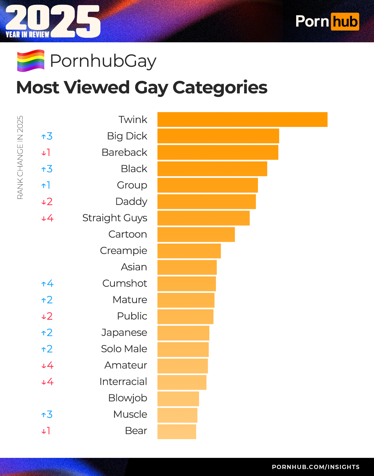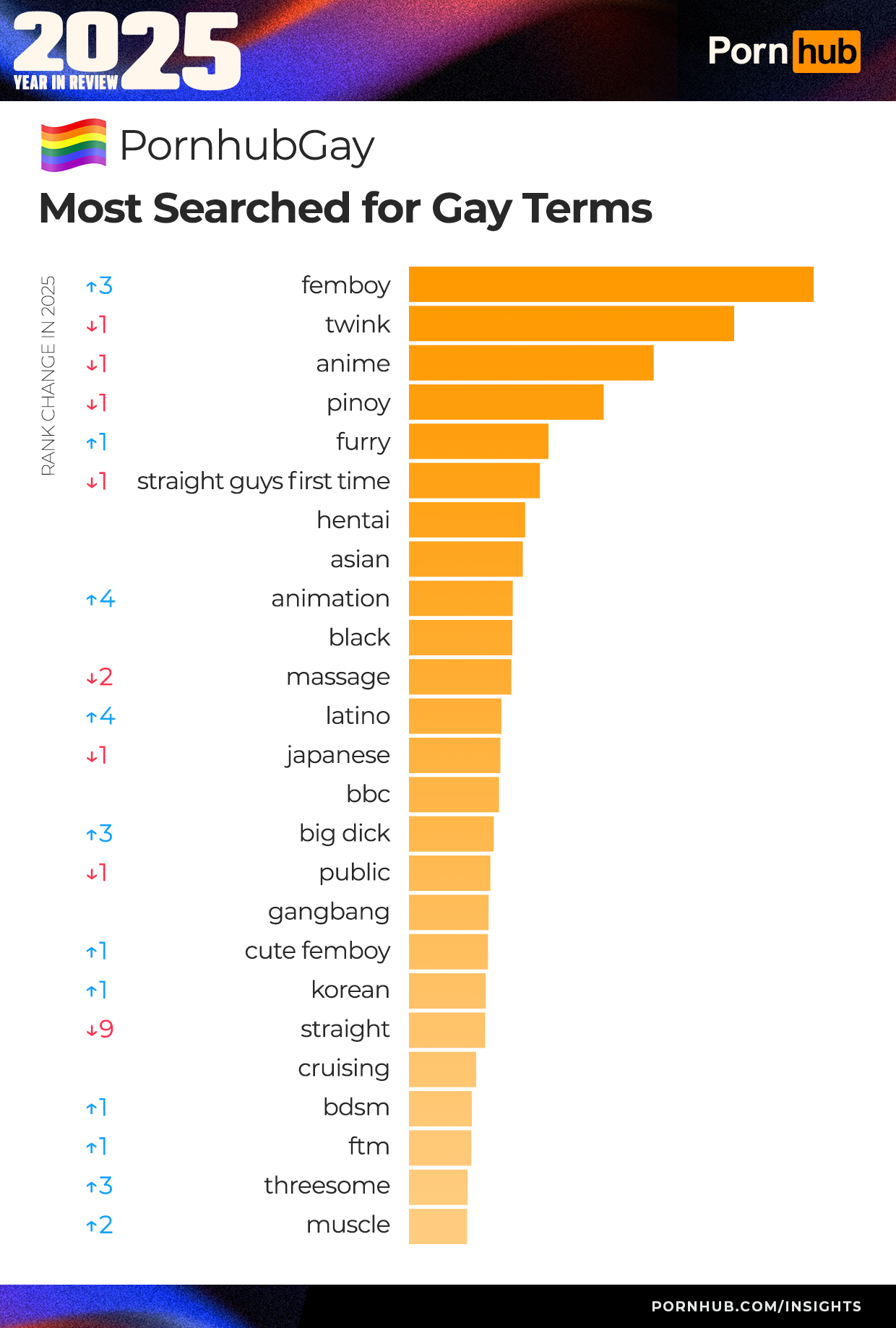 Noticeable changes in popularity this year include “femboy” which jumped up +15 places, landing in the 10th top searched term. This aligns with one of the growing trends this year, as more and more people are searching for content showing feminine adult men.