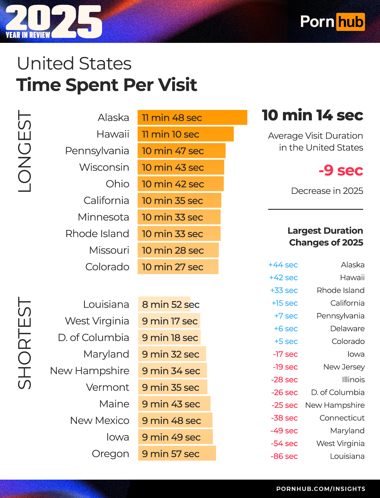 The states that spent the least amount of time on Pornhub included Louisiana at 8 minutes and 52 seconds, followed by West Virginia at 9 minutes and 17 seconds, and the District of Columbia, at 9 minutes and 18 seconds.