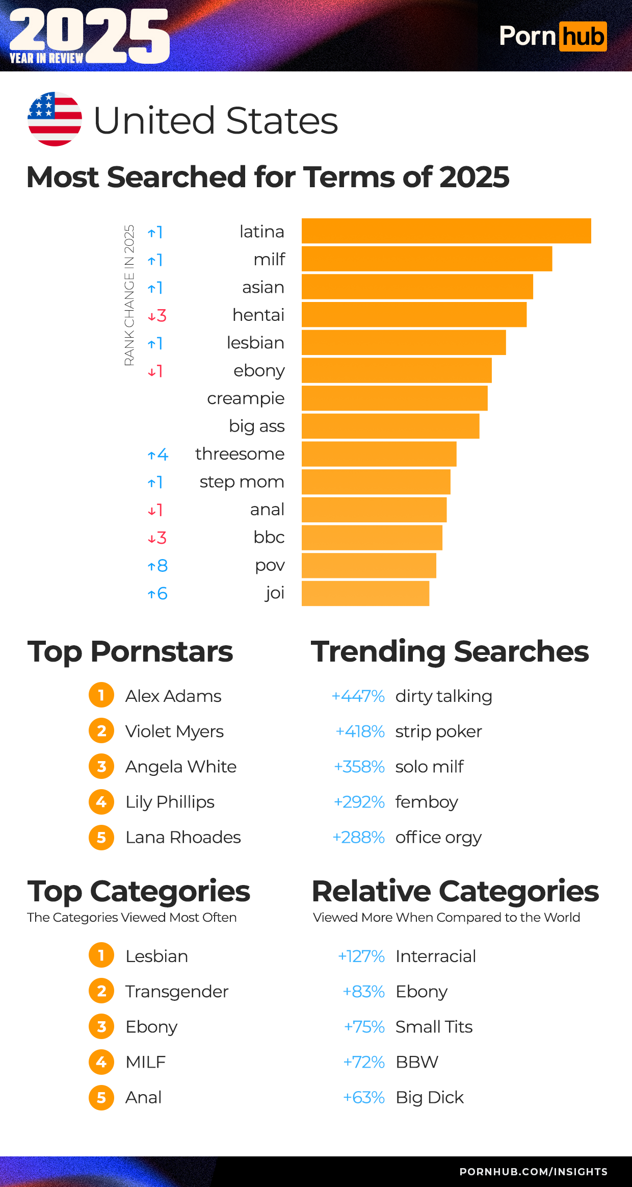 The top searched terms of 2025 within the United States saw a lot of shuffling this year. Latina was the top searched term in the US, dethroning “hentai” which dropped –3 spots, “milf” jumped to 2nd top searched term, and “asian” to 3rd.
