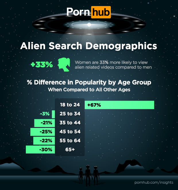 Women are proportionately +33% more likely to search for “alien” related videos when compared to men, and visitors aged 18 to 24 are +67% more likely to search when compared to all other age groups. Popularity drops off as visitor age increases, with those over the age of 45 being -25% less likely to search for “alien” porn.