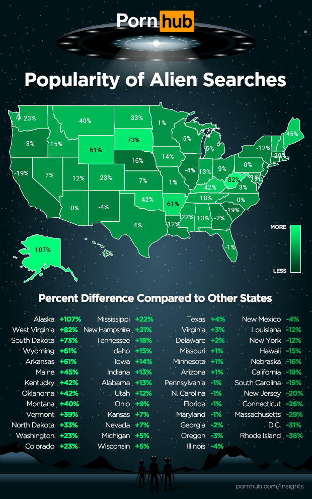Across the United States, visitors from Alaska are the most likely to search for “alien” porn by +107% more than the U.S. average. West Virginians are +82% more interested, South Dakota +73% and Wyoming +61%.