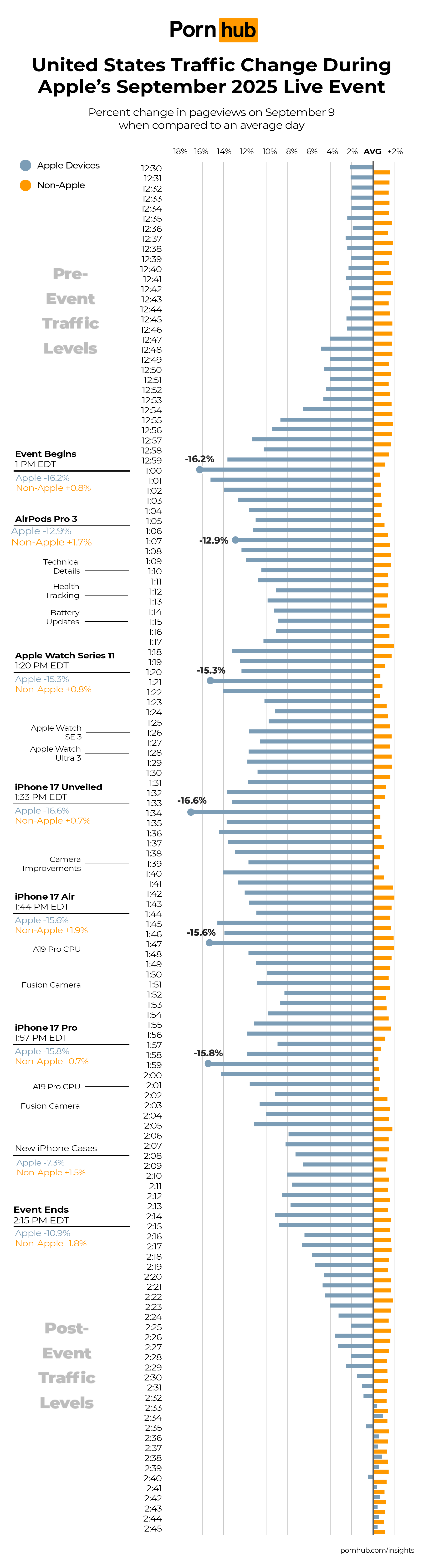 The finale of the event was the iPhone 17 Pro. Traffic from Apple users dropped by 15.8% at 1:59pm EDT, and increased 0.7% by non-Apple users.