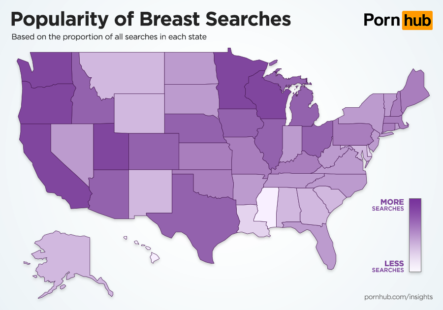 Now let’s take a look at how breasts stack up across the United States of America. Proportionately, the states most interested in search for breasts are Wisconsin, Minnesota, Oregon, Utah and Washington. Visitors from Mississippi, Hawaii, Delaware, Louisiana and the District of Colombia have the lowest proportion of searches.