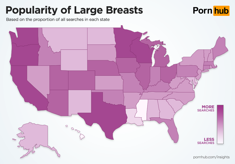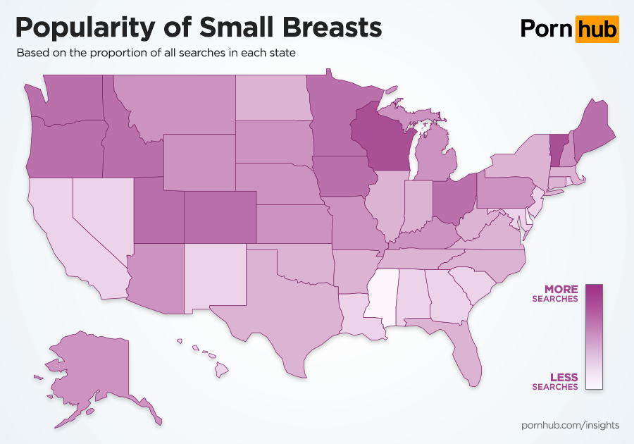Searches for large breasts are most popular in California, Wisconsin, Minnesota and (everything is bigger in) Texas. The states least interested in searching for large breasts are Mississippi, Hawaii, Delaware and Louisiana. Interest in small breasts is not necessarily an indication that the same people like large breasts. In fact, we see many of the same states likely to search for both types. Wisconsin and Minnesota are again quite interested in seeking small breasts, while Pornhub’s visitors from Mississippi, Hawaii and Delaware are equally less interested in small as large.