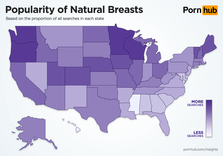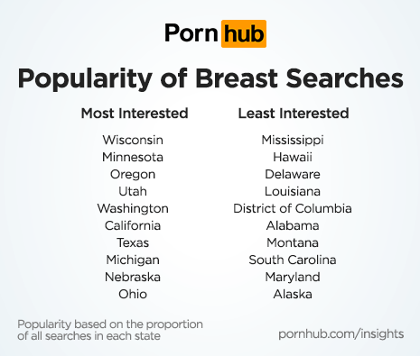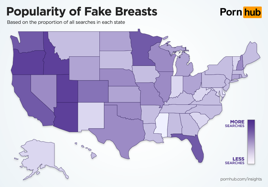 The states that are proportionately the most likely to search for fake breasts are Utah, Idaho, Oregon, Arizona and California. They are least popular in Delaware, Mississippi and Alaska. Natural breasts are more popular in Wisconsin, Oregon, Minnesota and Washington, but less popular in Hawaii, Mississippi and Delaware.