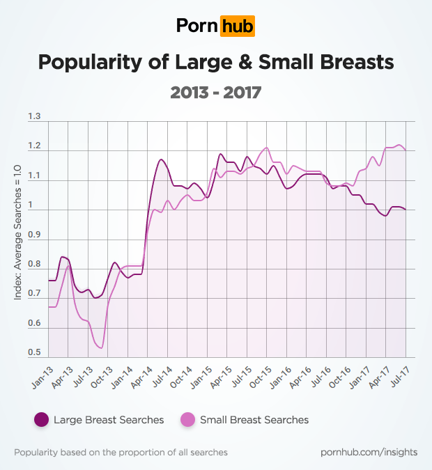 Both breast types saw a surge in popularity in the spring of 2014, but small breasts have shown significant growth over the past 12 months, while during the same period large breasts lost some of their support.