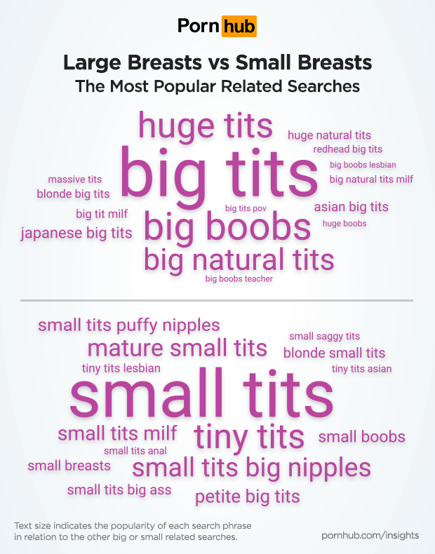 The following word-clouds illustrate proportionately how popular various search terms are within either the large or the small breast genres. Some terms combined with large breast searches include “massive”, “redhead“, “asian”, “teacher” and “pov” (point of view). Small breast related searches are often combined with terms like “puffy nipples”, “mature”, “saggy”, and “tiny”.