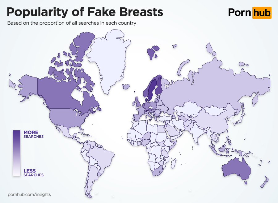 With the exception of Canada and Australia, the top ten countries searching for fake breasts are all located in Europe including Denmark, Sweden, Finland, Norway and Austria. Many of these countries also have a significant number of visitors searching for natural breasts.