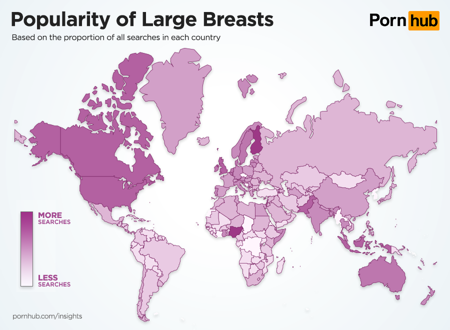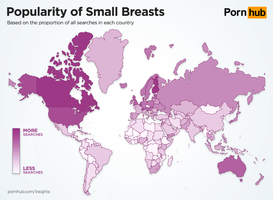 Large breasts are again biggest in Nigeria, along with Finland, Indonesia and Canada. The countries least interested in big breasts are Egypt, Colombia and Argentina. Small breasts are also quite popular with visitors from Finland and Canada, but Columbia is the country least interested in searching for them.