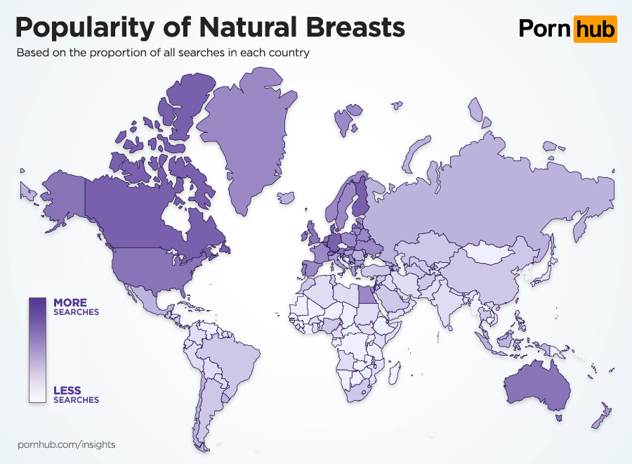 Finally, let’s take a look at the countries which are more or less interested in breasts, and what types they prefer. The country that proportionately searches the most often for breasts is Nigeria, followed by Finland, Canada, United Kingdom and the United States. Breast related searches are least common in Peru, Brazil, Argentina, Chile, Mexico, Algeria and Russia.