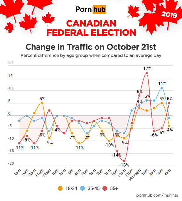 Election day had by far the greatest impact on Pornhub visitors over the age of 55. In the morning, over-55 traffic was down by -11%, and at 10pm in the evening, their traffic was down by -18%, compared to a -9% drop by those aged 18-34 and only -6% for 35-45 year olds.