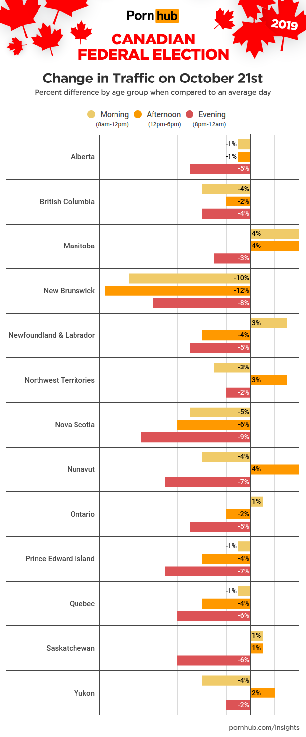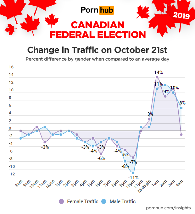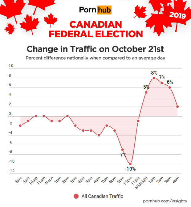 Pornhub traffic across all of Canada dropped as much as 10% from 9pm to 10pm as many people across the country were tuned in to watch the live election results. After midnight when most media outlets had announced their predictions, traffic jumped 8% above average by 1am.