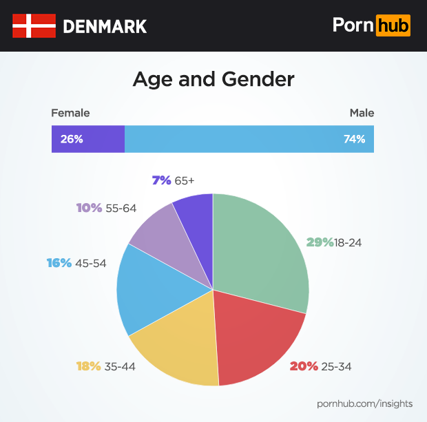 Denmark ranks 28th worldwide for traffic to Pornhub, an impressive showing considering their worldwide population rank of 114th. The average visitor spends around 9 and a half minutes each time they visit, just a few seconds less than the worldwide average. Women account for 26% of traffic, matching the world, but less than nearby Norway’s 28% female traffic. The average visitor age is 3 years older than the world at 38 years.
