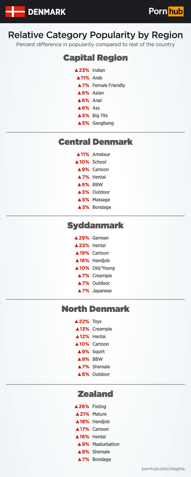 In the Capital Region of Denmark, the “Indian” category is proportionately 23% more popular than elsewhere in the country, as well as “Arab” which is 11% more popular. In Central Denmark, “Amateur” is 11% more popular. Along the Southern border with Germany, views of the “German” category are 29% higher than elsewhere in the country. In North Denmark, sex “Toys” are 22% more popular, and in Zealand, “Fisting” is 26% more popular.