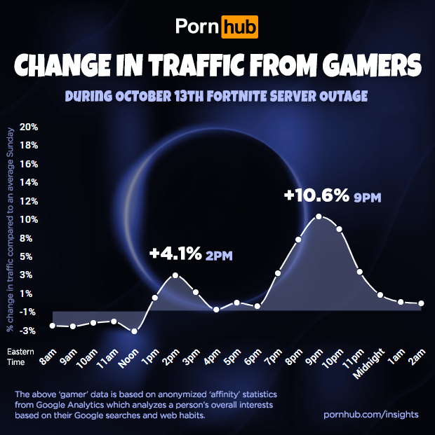Video games are a popular search genre on Pornhub, including Fortnite which is searched for more than a million times each month. So perhaps it’s no surprise when Fortnite’s game play servers were taken down on Sunday, October 13th that players went to find their fix on Pornhub instead.