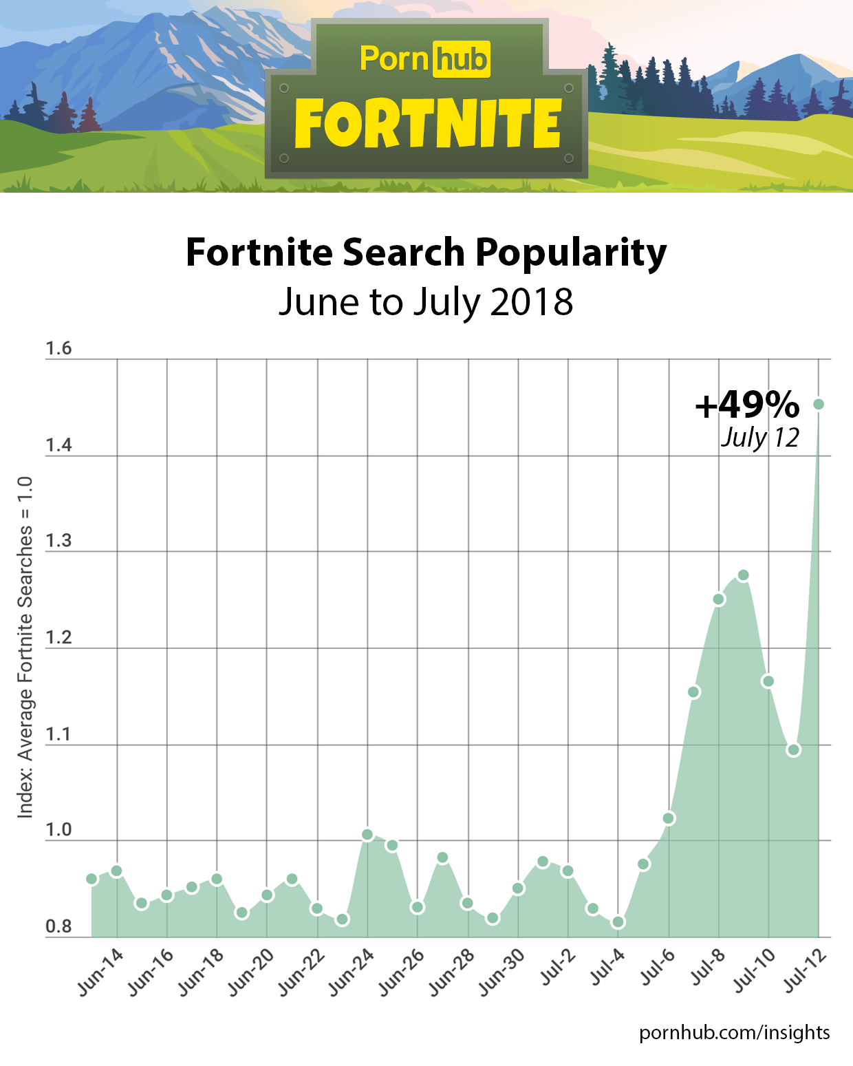 We found that searches grew in the days leading up to the anticipated launch, then gained an impressive +49% on July 12. That brought “fortnite” into Pornhub’s Top 15 most popular search terms.