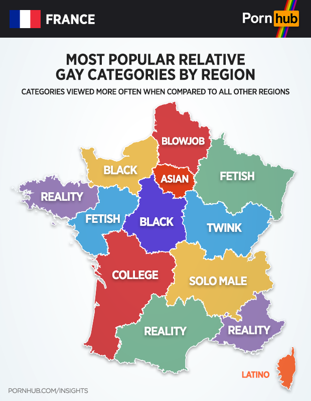 Certain categories are relatively more popular in different regions of France, when compared to the rest of the country. In Ile-de-France, the Asian gay category is 17% more popular. Solo Male is 57% more popular in Auvergne-Rhone-Alpes, and Blowjob is up 74% in Hauts-de-France. The Reality category is relatively more popular in Brittany (+66%), Occitanie (+38%) and Provence-Alpes-Cote d’Azur (+33%).