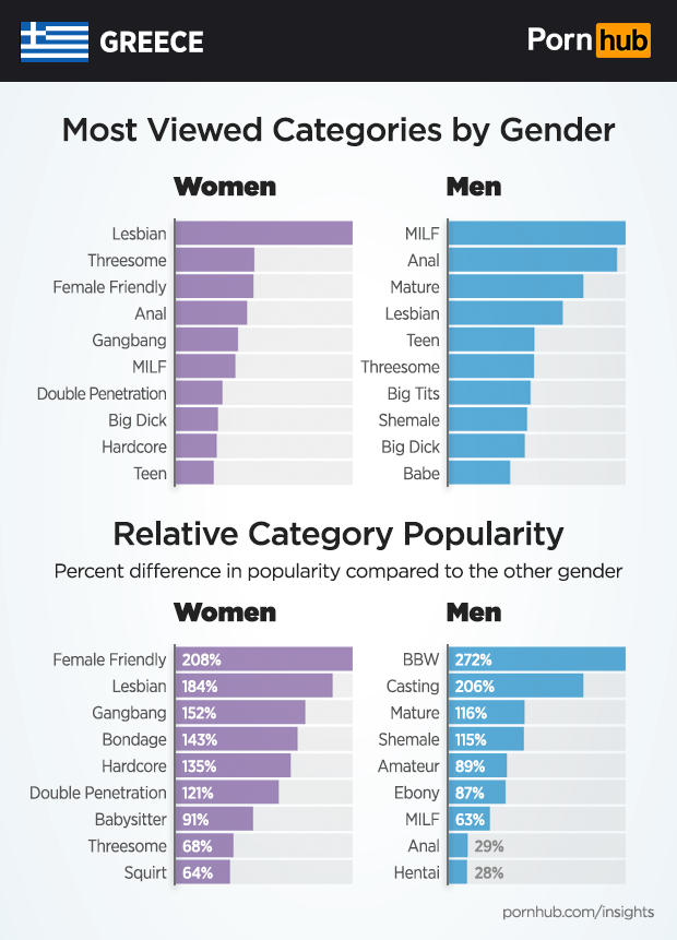 Greek women most often view the Lesbian, Threesome and Female Friendly categories, while men prefer MILF, Anal and Mature videos. In previous studies we have noted the popularity of lesbian porn among women.