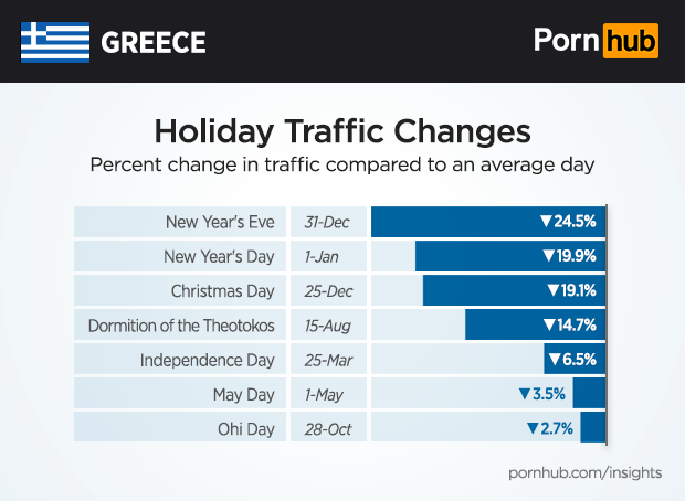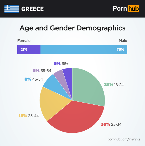 In this edition of Pornhub Insights we’re taking a look at the current porn habits of the Mediterranean country of Greece. We last looked at Greece back in 2015, so the folks at Lifo.gr checked in to see how Greek porn preferences have changed since then. While overall traffic from Greece has increased, the rank has dropped from 21st worldwide to 24th. This is mostly due to growth in other countries as seen in our last Year in Review.