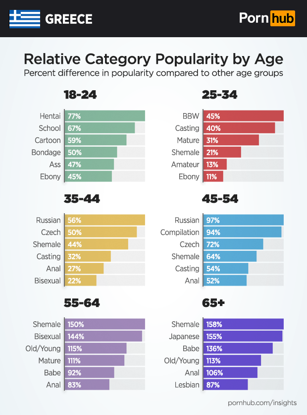 By comparing the relative popular among Greek age groups, we can see that Hentai is 77% more popular with 18 to 24 years old compared to all other age groups, along with a 67% increase in popularity for School and 59% for cartoon” parodies. 25 to 34 years old are 45% more likely to view BBW and 40% more for Casting. Both the 35 to 44 and 45 to 54 age groups are more likely to view the Russian category, while Greek visitors over the age of 55 are more than 150% more likely to view Shemale (transgender) videos.