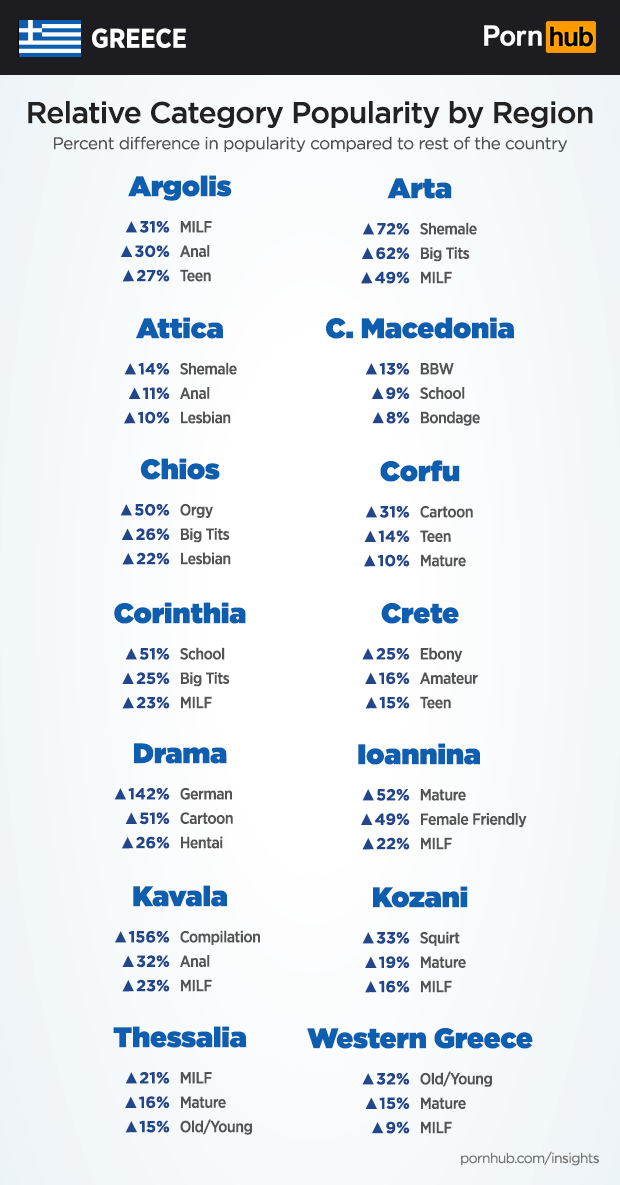 The most viewed categories in Greece are Lesbian, Anal, MILF and Mature.