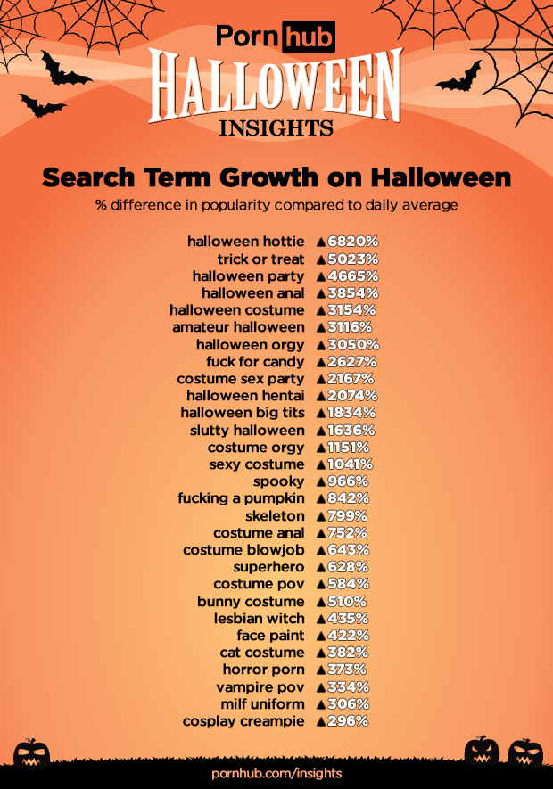 To see what activities turn people on during Halloween, our statisticians looked back to 2017 to see what terms were more likely to be searched on October 31st when compared to their daily average. Searches for “Halloween hottie” shot up 6820%, followed by a 5023% increase for “trick or treat”, 4665% for “Halloween party” and 3854% increase for “Halloween anal”.