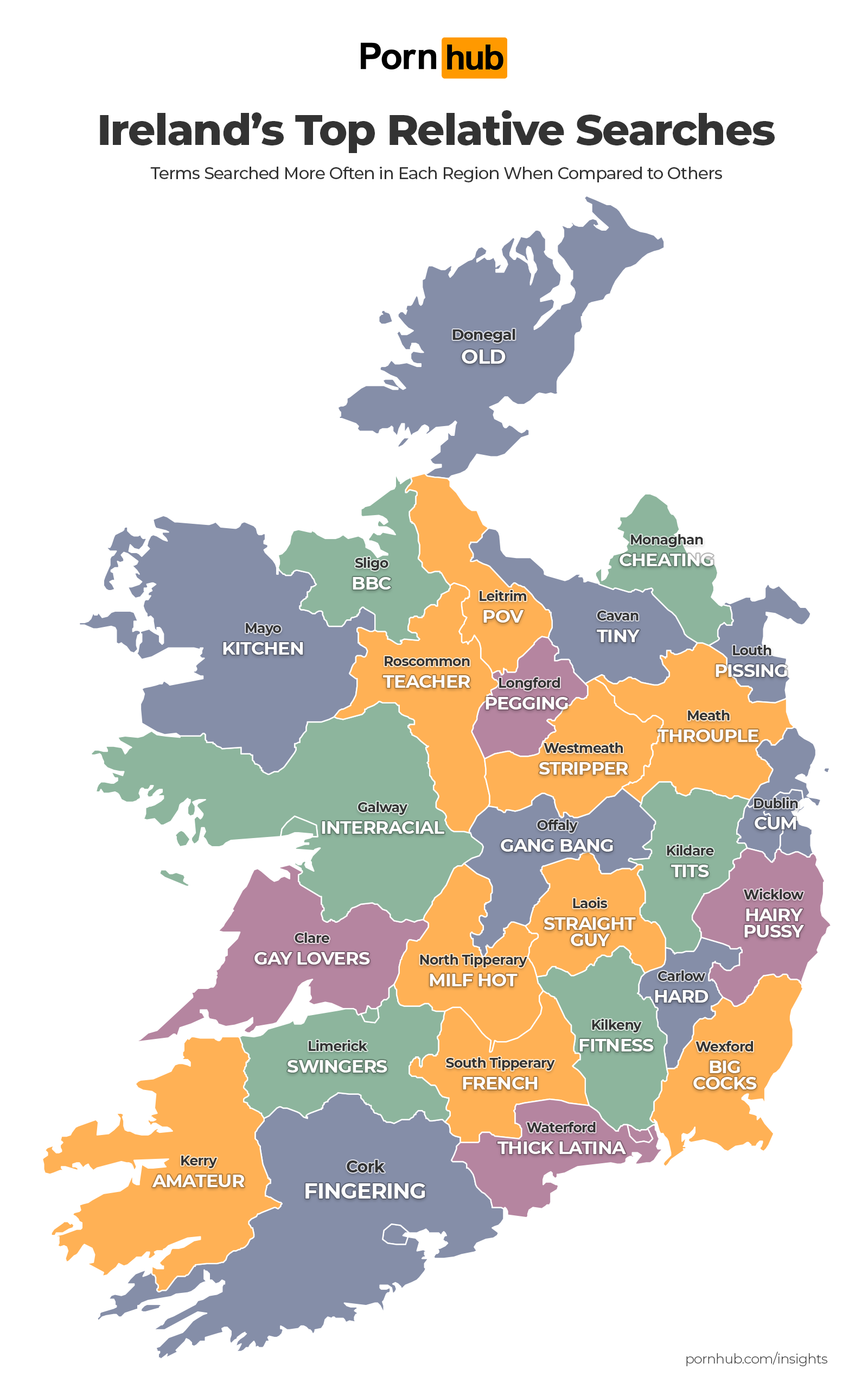 On the west coast, Clare liked searching for “gay lovers” and Galway liked “interracial.” On the other side, in the east, Wicklow enjoyed “hairy pussy” while Dublin couldn’t get enough “cum.” Up in the northeast, Louth particularly enjoyed “pissing.”