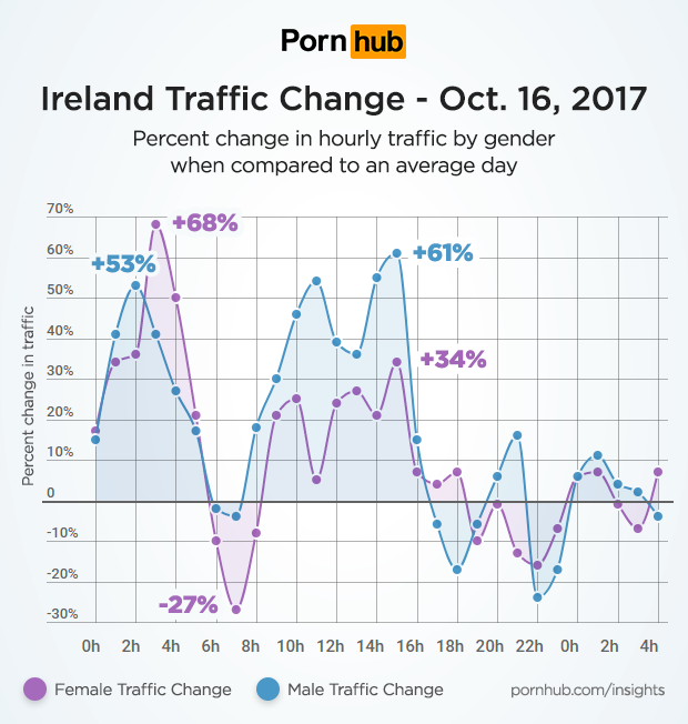 We also found that October 16th traffic changes varied between Irish men and women. At 02:00, female traffic was up 53% compared to their average level, but at 03:00 Irish men peaked at 68% above average. At 07:00 in the morning, Irish women were on Pornhub 27% less than usual, while traffic from men was close to average. Later in the day, it seems that more of the traffic increase came from men, with their traffic being 61% above average at 15:00, and women up 34% during the same period.