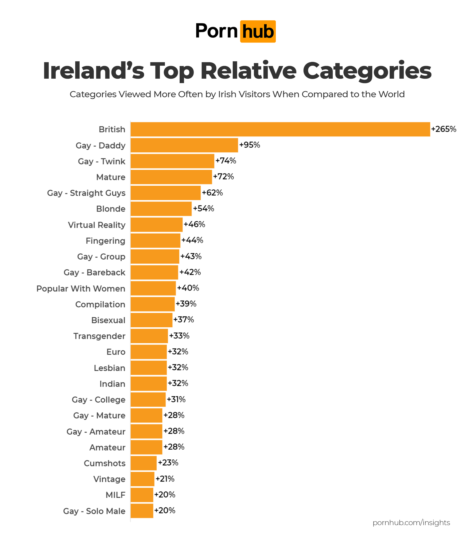 The “British” category is +265% more popular in Ireland, with “Mature” porn being viewed +72% more often. Porn videos tagged as “Blonde” are viewed +54% more often by Irish visitors.