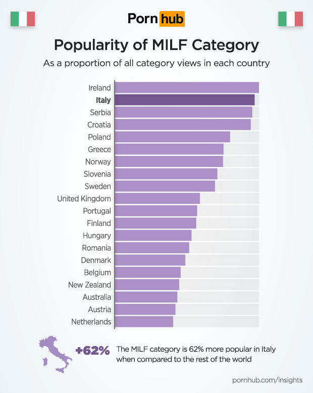 Se consideriamo la categoria “Milf” nel mondo, scopriamo che l’Italia è il secondo paese che guarda di più questa categoria (ben il 64% rispetto alla media mondiale), superata solo dai mammoni irlandesi.