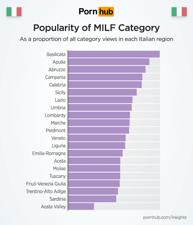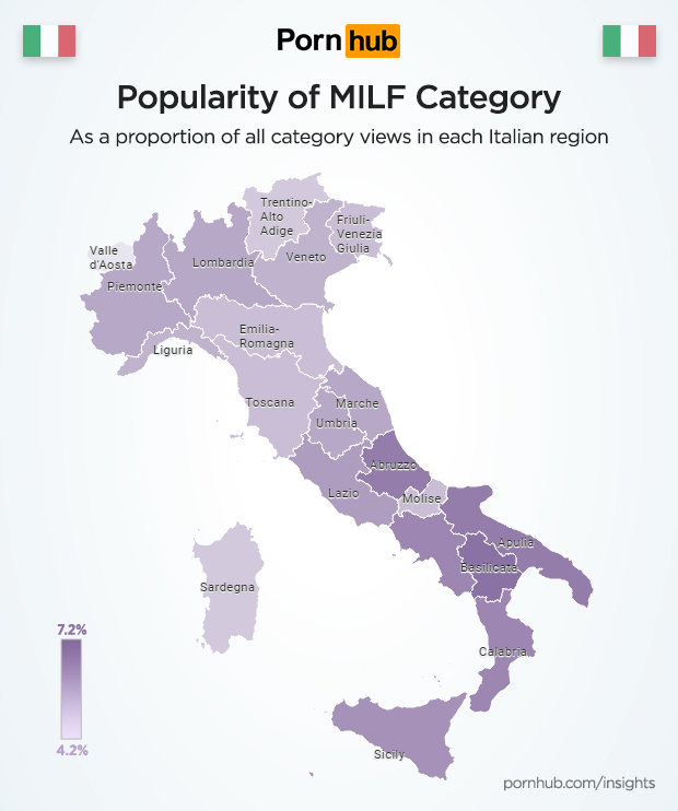 There are vast cultural differences from one region to another in the country, a fact which is also reflected in the map that shows the popularity of the MILF category in each Italian region.