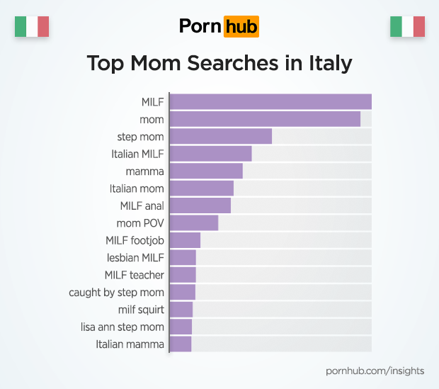 Currently, ‘MILF’ outranks both ‘Mum’ and ‘mamma’ in search volume, followed by ‘Italian mom’. Videos featuring the most popular pornstar in Italy Lisa Ann as a ‘step mom’ are one of the most searched.