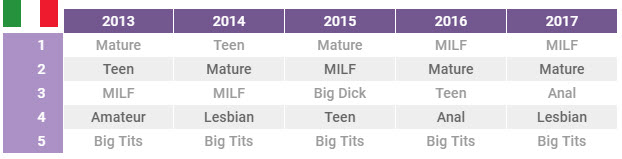 If we look at the past 5 years, there’s a growing trend toward MILF and Mature categories in Italy. They both have had one place among the 5 most viewed categories since 2013, and since 2015 Mature and MILF are the top 2, and in 2017 the “teen” category disappeared. So we can clearly see that Italian people really appreciate the “adult” women more.