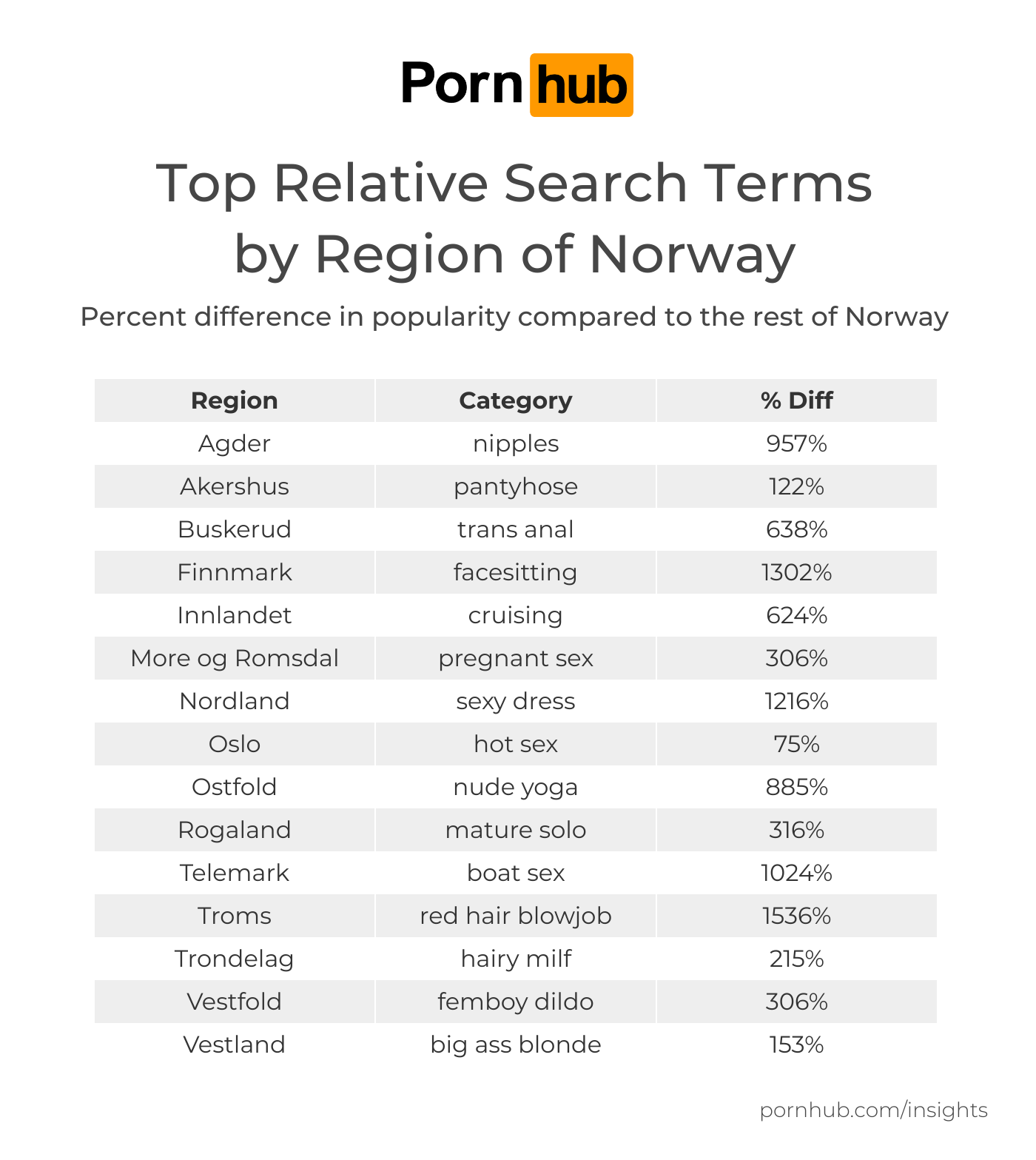 Looking at the difference in terms by region broke down Norwegian interests even further. In Troms, “red hair blowjob” saw a 1,536% difference. In Finnmark, “facesitting” saw a 1,302% difference. Nordland liked “sexy dress” at a 1,216% difference. And Telemark enjoyed “boat sex” at a 1,024% difference.