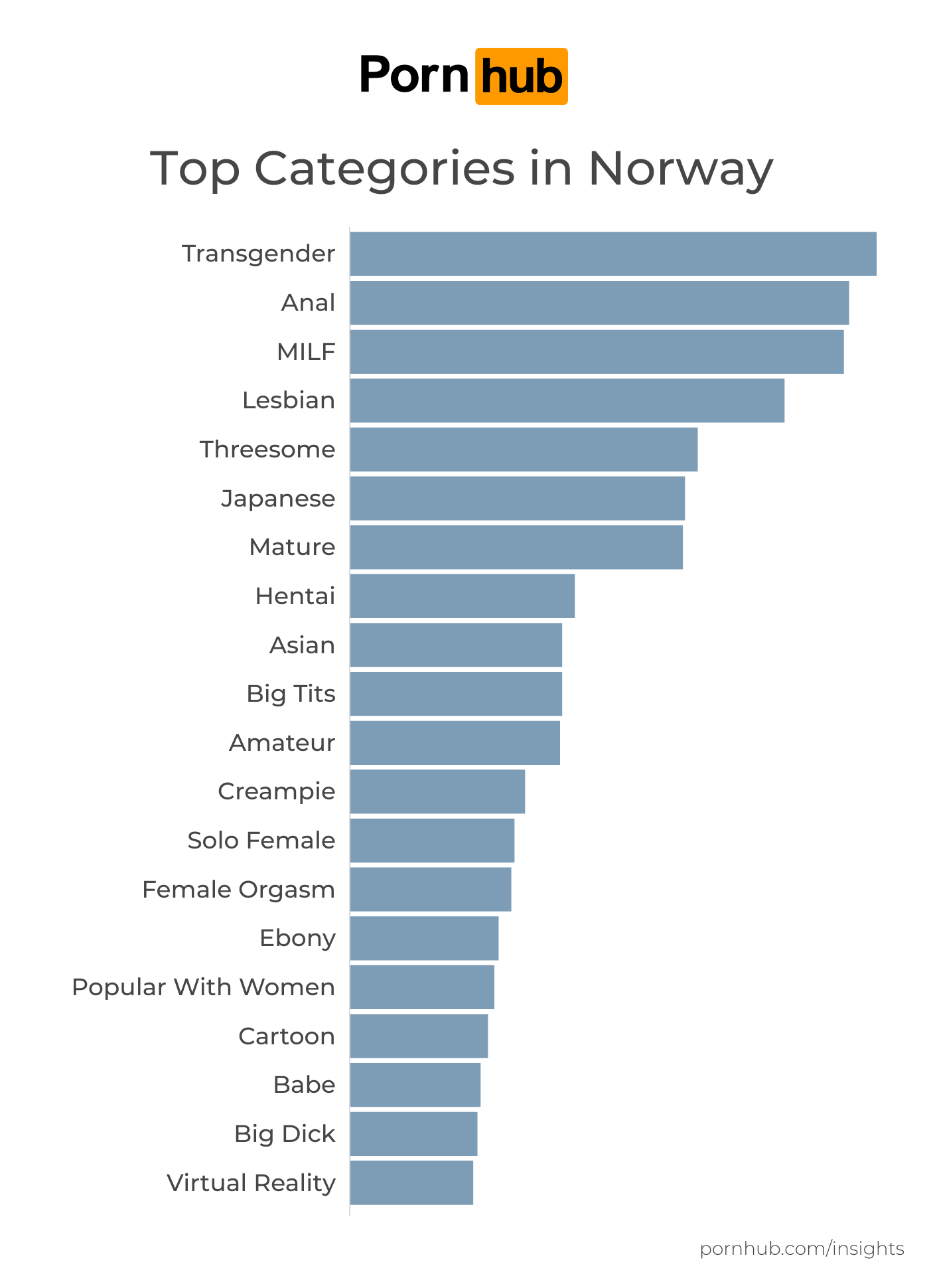 The top categories in Norway are Transgender in 1st, followed closely by Anal and then MILF.