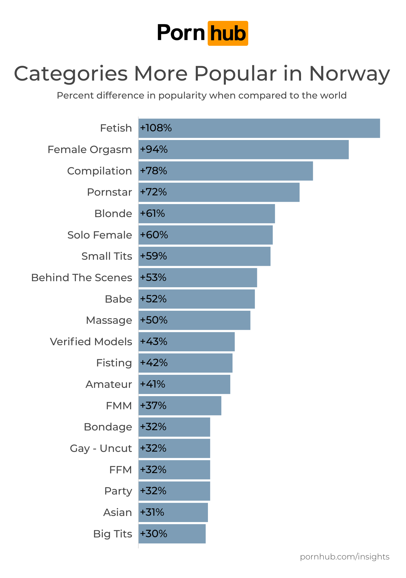 Despite the popularity of many amateur creators in Norway, the Pornstar category was +72% more popular and Amateur was +41%.