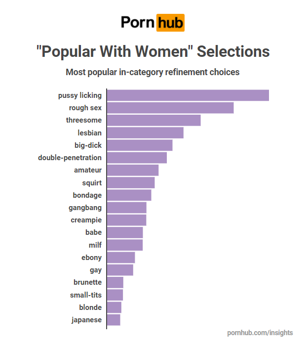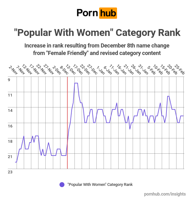 As a result of the new category name and aggregated content, “Popular With Women” has significantly increased the rank of the previous “Female Friendly” in the few just the months since it’s launch. We have also found that women spend nearly a minute longer on Pornhub (10 minutes 30 seconds) when they begin browsing the new category, compared to the previous (9 minutes 36 seconds).