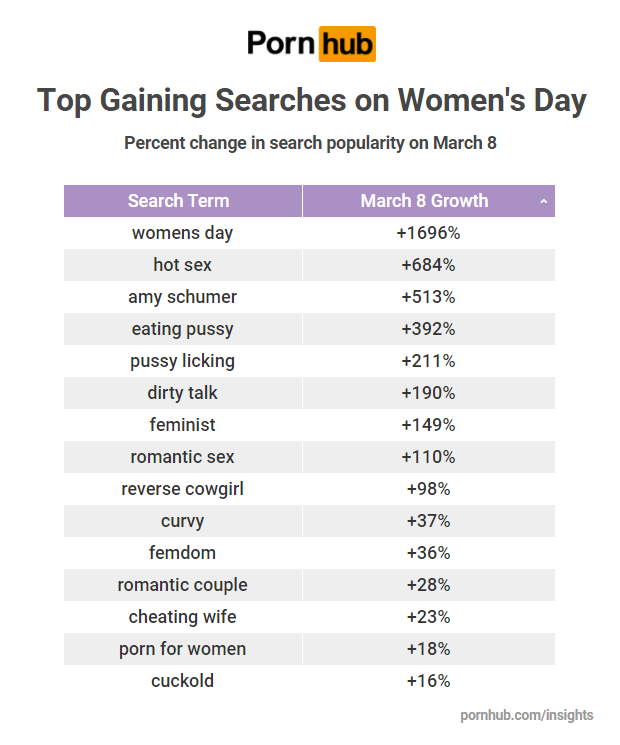 Our statisticians noted several search terms that increased in popularity on March 8th. Searches containing “womens day” were up 1696% among both genders, as well as a 684% increase in searches for “hot sex”. Amy Schumer saw a 513% gain in searches for her name, most likely a result of her speaking out publicly for women on that day. More attention was being paid to female pleasure, with cunnilingus related searches increasing dramatically. And just as we found on the day of the Women’s March, searches for “feminist” porn also increased. Other gaining terms like “cuckold” and “romantic” were also featured in our Valentine’s Day Insights.