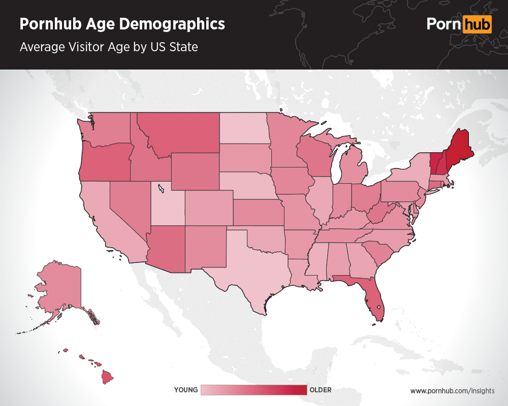 These heat maps help illustrate this more concretely. As we can see in the heat map below, the highest concentration of older Pornhub viewers are located within New England. Specifically, Maine, New Hampshire, and Vermont are home to some of our more senior American viewers, with other sizable pockets located in Hawaii, Florida, Arizona, Oregon and Montana.