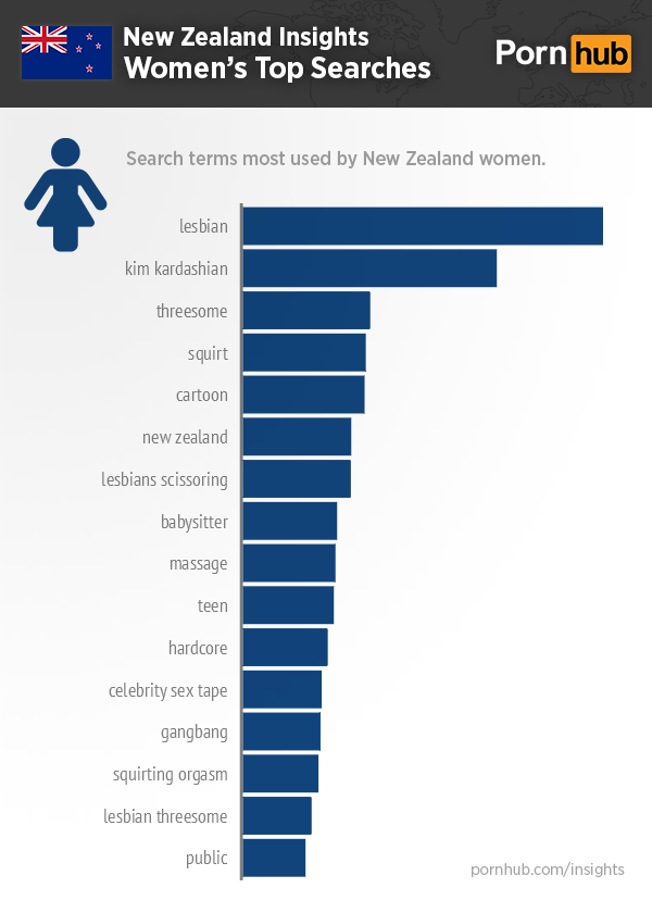 pornhub-insights-new-zealand-women-searchesOverall, we noticed some interesting similarities between the women of New Zealand and the search habits of women all over the world, as detailed in our post on What Women Want. Much like in the rest of the nation, Kiwi women are most interested in watching girl on girl type content overall. Women everywhere seem to enjoy the sapphic stuff most when, as well as scenarios involving multiple partners and watersports. ‘Squirt,’ ‘threesome’ and ‘gangbang’ all rank relatively high on the list here but it’s ‘Kim Kardashian‘ who steals the show in second place, with another possible homage to her body of work on Pornhub in ‘celebrity sex tape’ ranking in at 12th place for the most searched term among women.